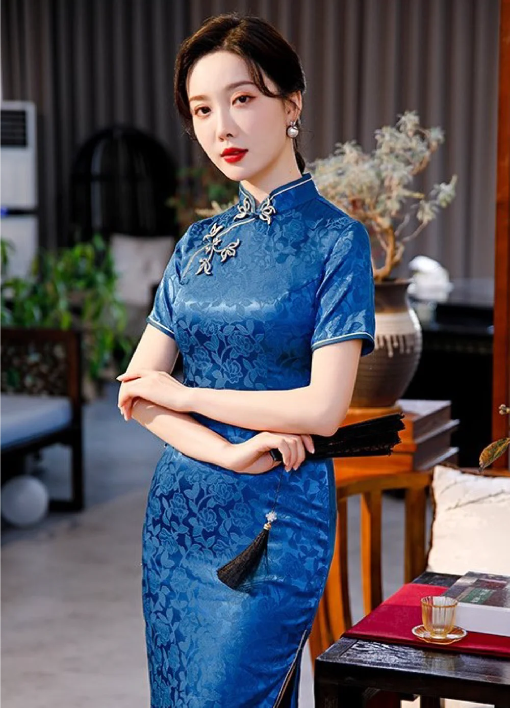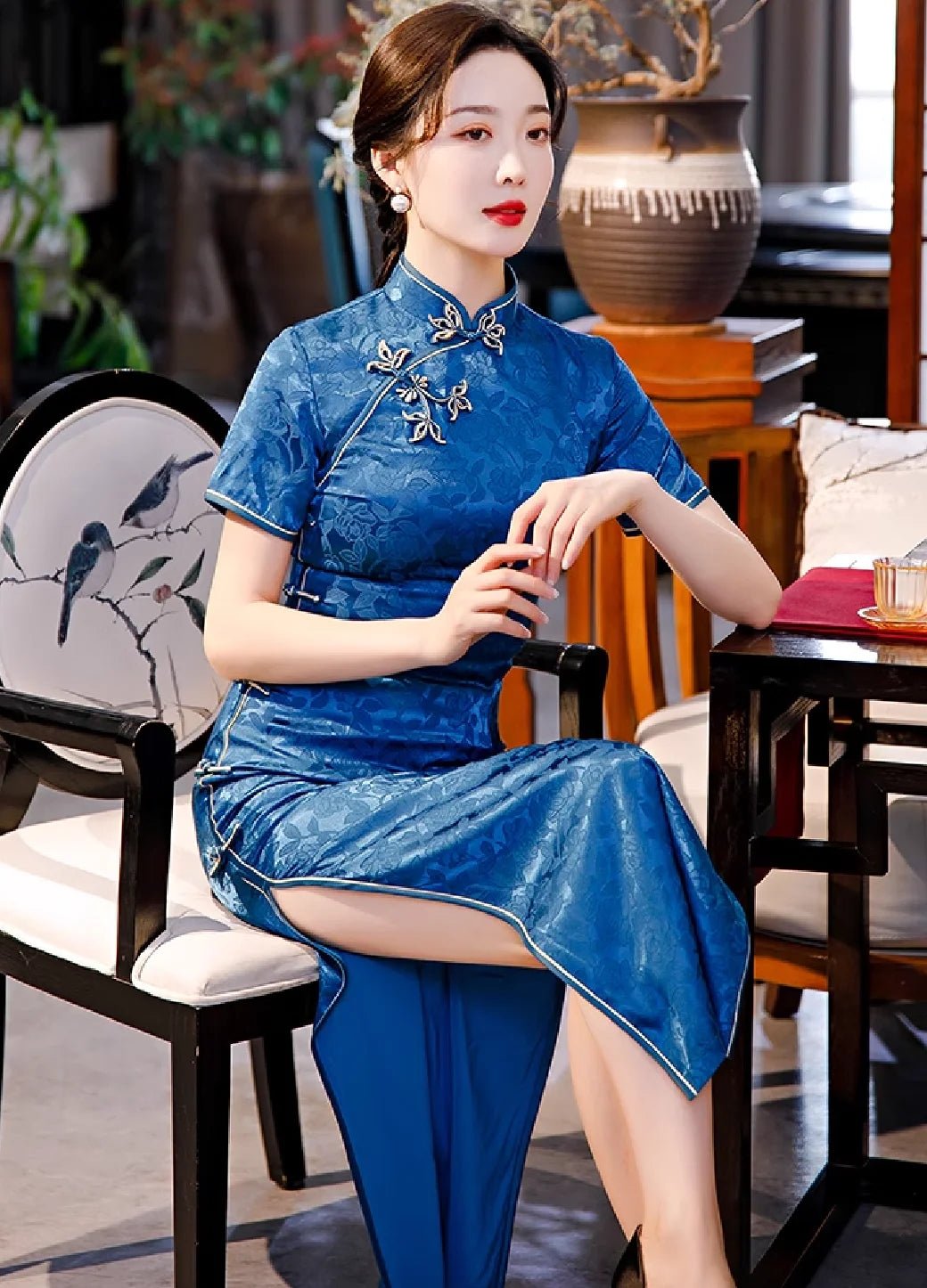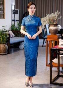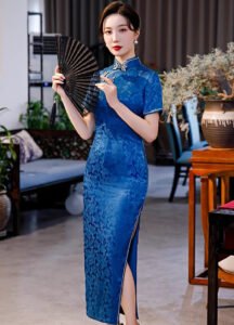 A blue traditional qipao dress full of elegance