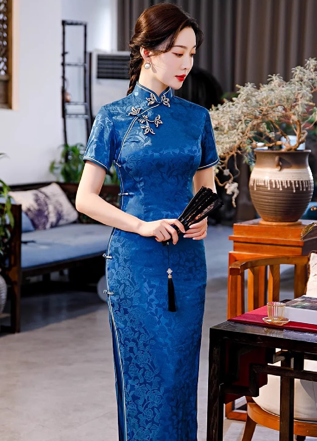 Enhance your elegance with a sophisticated blue traditional qipao dress with beautiful details. This azure Chinese dress is made with a flower pattern that can instantly elevate your look. It features stunning roses that are famous as a symbol of love and beauty in China. This makes this satin qipao with rose motifs even more meaningful.