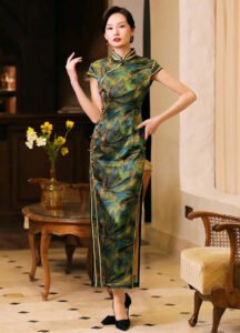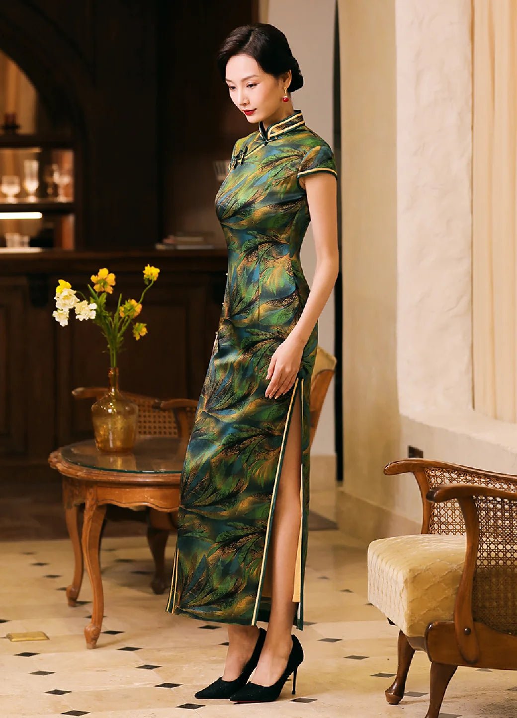 Find the perfect green silk qipao dress that will make you look sophisticated and elegant. Elevate your style with this gorgeous green Chinese dress tailored with a graceful neckline. flattering silhouette. and soft silk fabric. This stylish qipao gown is an excellent option to wear for special occasions like celebrations. galas. or social gatherings.