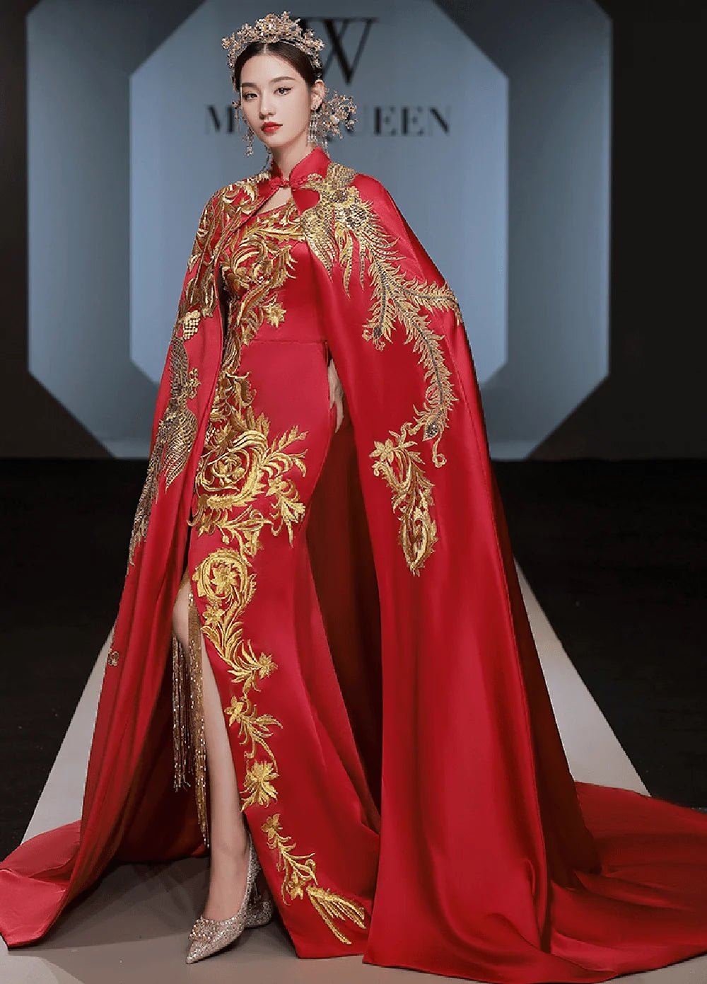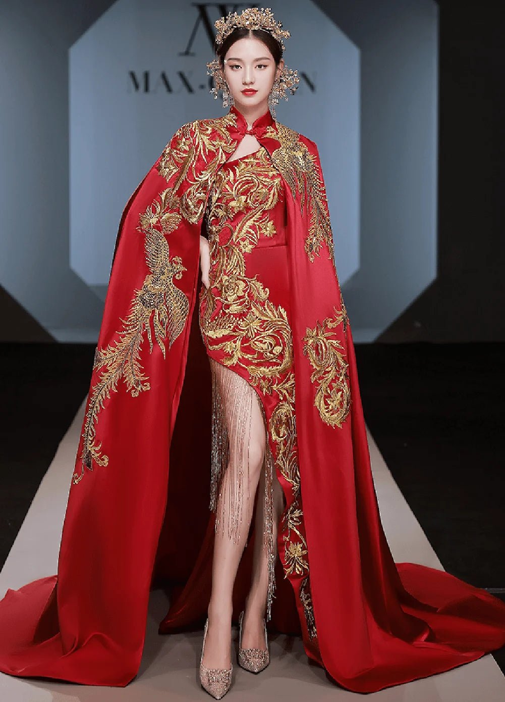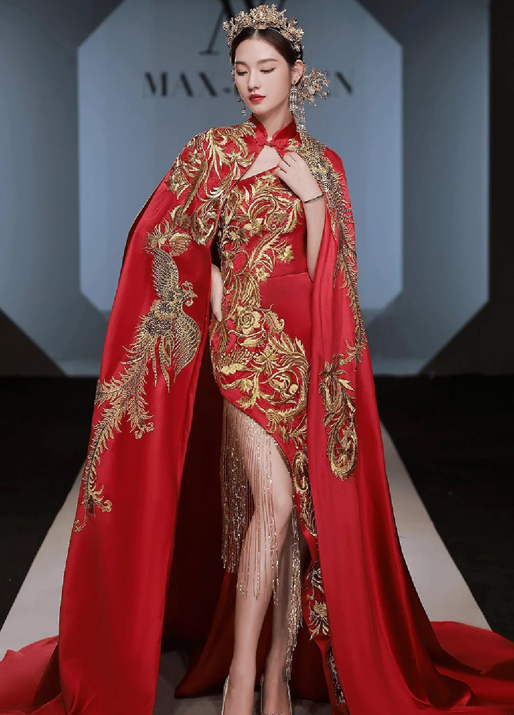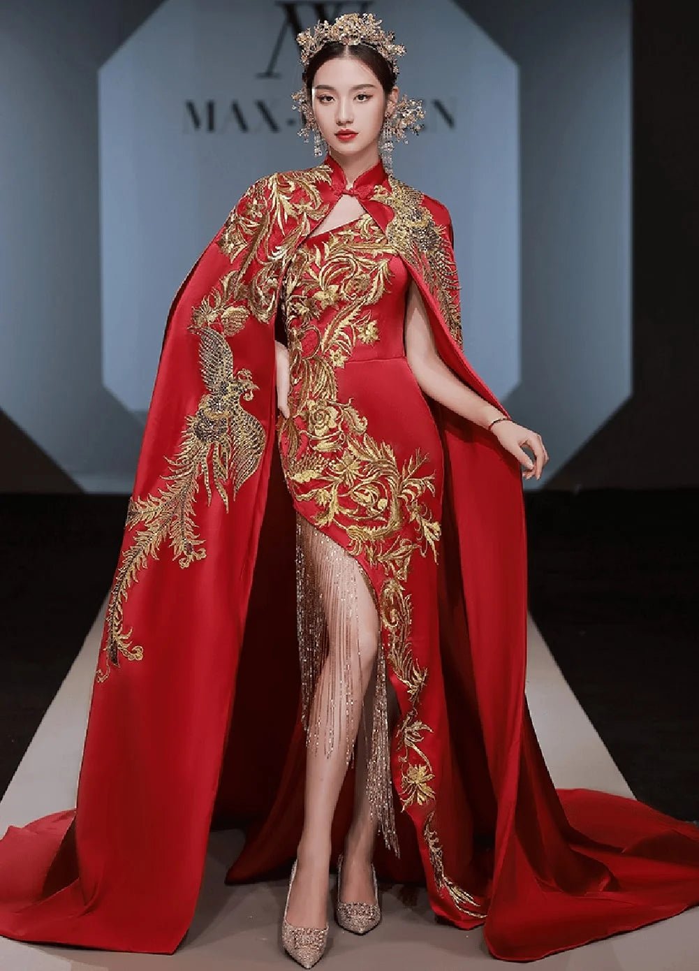 • Details: elegant qipao with a cape in golden Chinese embroidery