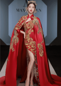 The qipao luxury ensemble is made of a glamorous cape and a long designer dress. The stunning cape adds a dramatic effect to the outfit with its elongated train. The traditional qipao elements like the high mandarin collar and Chinese Pankou button create a timeless design full of charm.
