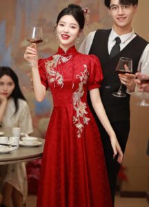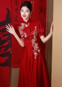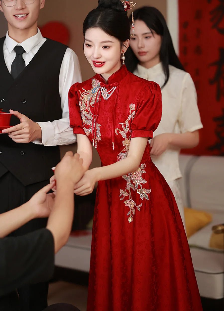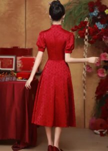 Fall in love with a graceful red A-line cheongsam dress. its incredible silhouette. and gorgeous details. With this graceful Chinese dress. you will elevate your wardrobe and create memorable outfits. What makes this cheongsam garment so special is its auspicious traditional embroidery decorated with beads and feminine puff sleeves.