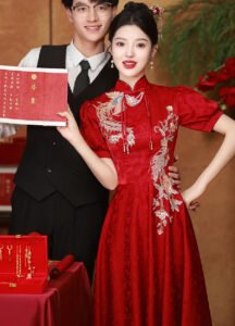 Let yourself be charmed by this fascinating A-line women’s dress. The auspicious red color of the qipao evokes optimism and cheerfulness. It will make you the center of attention no matter where you go. Both enchanting and enigmatic. this classy Chinese dress will get you endless compliments. If you would like to explore more styles of . make sure to check out our dedicated collection.